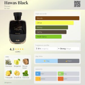 عطر Haws Black للرجال عطر شرقي خشبي منعش. يجمع بين نفحات الحمضيات المنعشة مع العود العميق والأخشاب والعنبر، لرائحة جذابة وقوية.