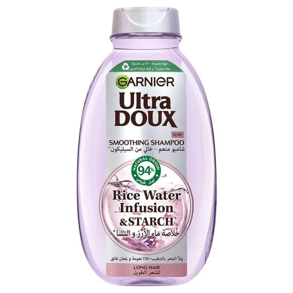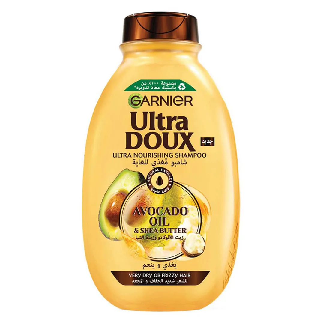 شامبو غارنييه ألترا دوكس بتركيبته الغنية بالمكونات الطبيعية (مثل العسل، الألوفيرا، زبدة الشيا). يغذي الشعر بعمق، يقويه، ويمنحه النعومة واللمعان. مناسب لجميع أنواع الشعر.