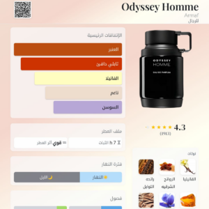عطر أوديسي هوم للرجال عطر كلاسيكي أنيق. يجمع بين نفحات الحمضيات المنعشة والأزهار مع قاعدة دافئة من الأخشاب والتونكا.