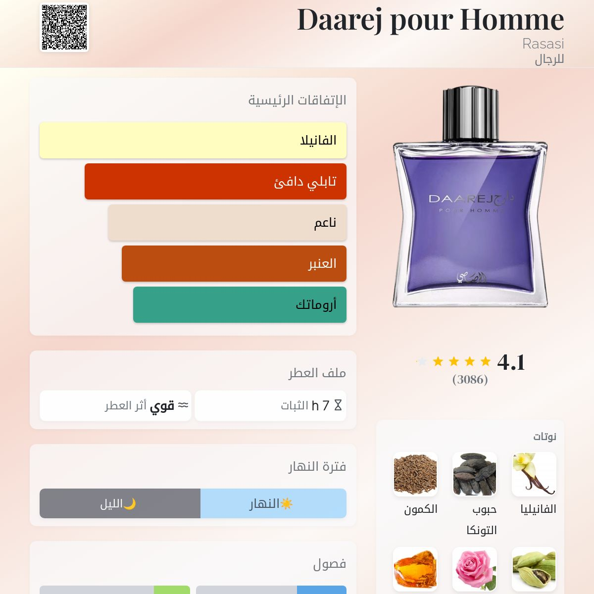 عطر رصاصي دارج للرجال عطر شرقي خشبي قوي. يفتتح برائحة الزعفران والبرغموت، مع قلب من العود ووسط من الأرز، وقاعدة من العنبر والمسك.