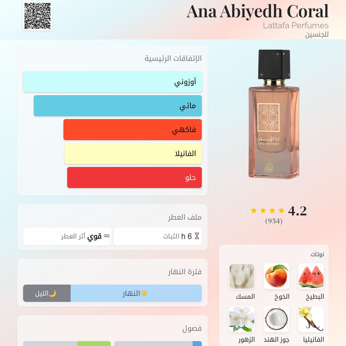 عطر لطافة أنا أبيض كورال النسائي عطر منعش وحيوي يجمع بين نفحات الأزهار المرجانية والفواكه الحمضية مع قاعدة دافئة من المسك، لرائحة رقيقة ومبهجة.