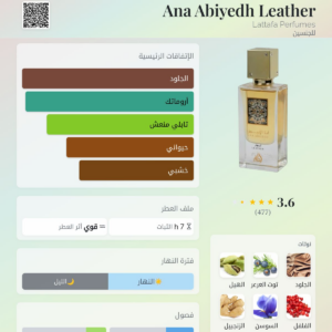 عطر لطافة أنا أبيض ليذر النسائي عطر فاخر وجريء. يجمع بين نفحات الجلود الفاخرة مع الأزهار الشرقية والمسك، لرائحة قوية وجذابة.