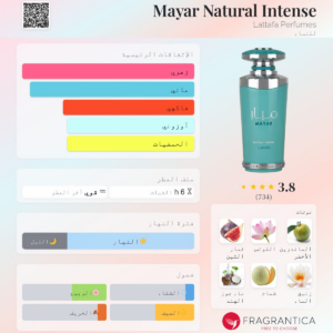 عطر لطافة مايار ناتشورال إنتنس النسائي عطر شرقي زهري مكثف. يجمع بين الأزهار الغنية مثل الياسمين والورد مع قاعدة عميقة من العود والعنبر.