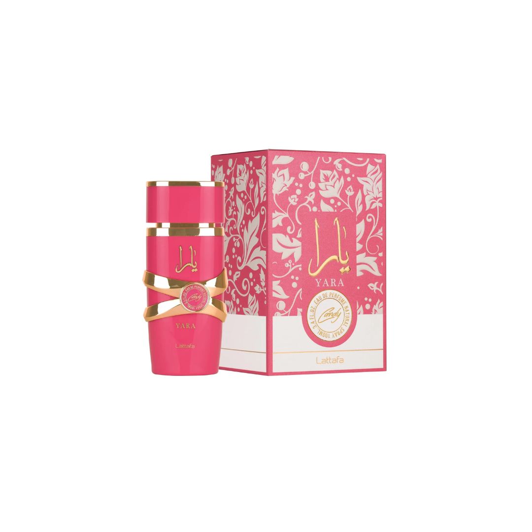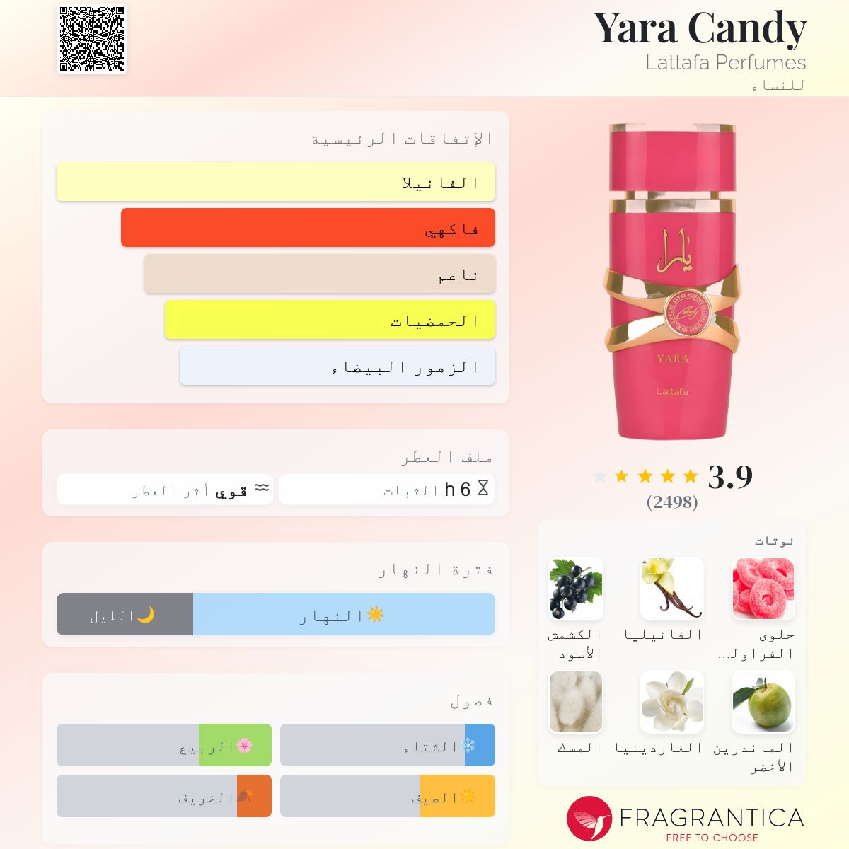 عطر لطافة يارا كاندي النسائي عطر جذاب ومميز بنفحات حلوة تشبه حلوى الفواكه والسكر مع لمسات الأزهار الناعمة، مثالي لمحبات الروائح الحلوة.