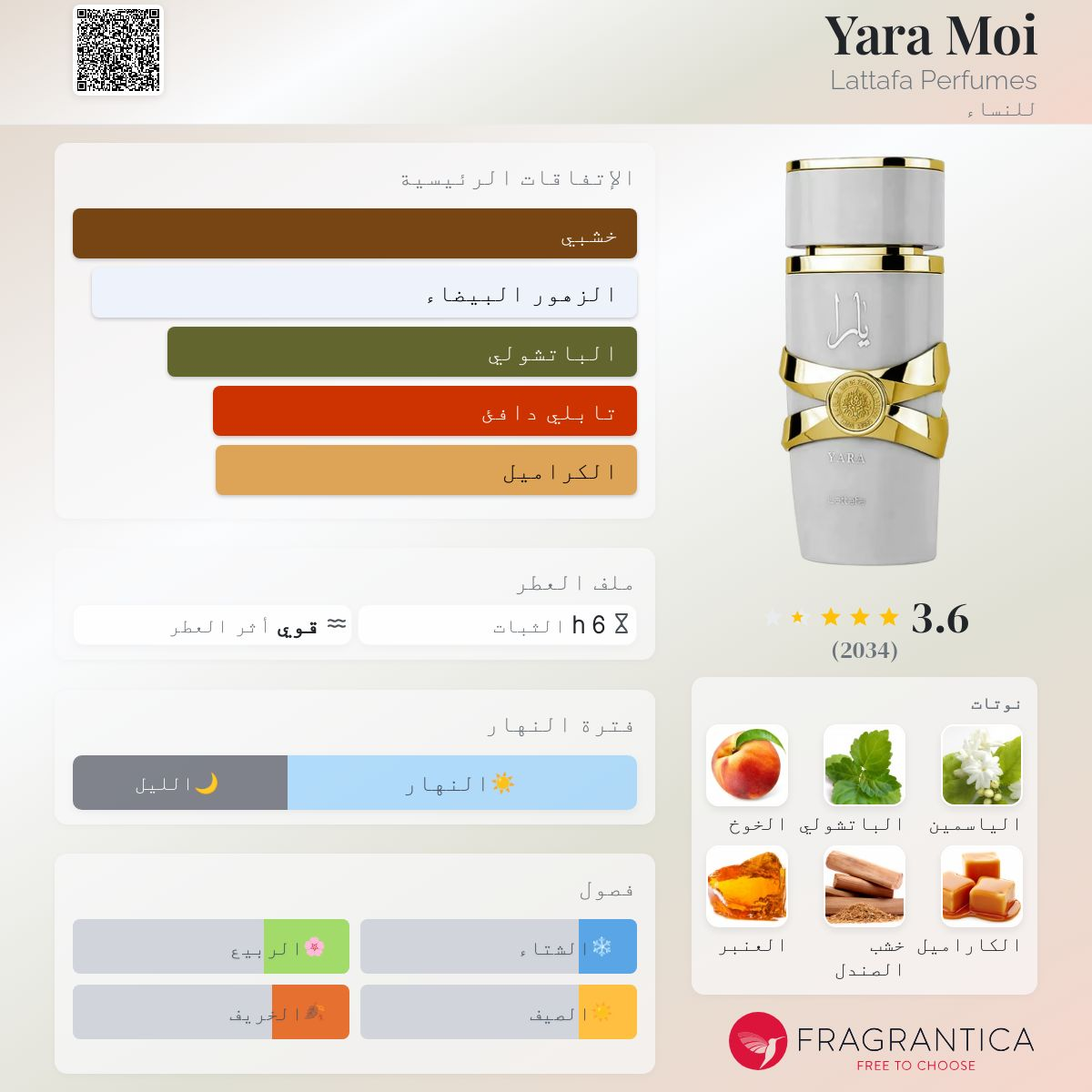 عطر لطافة يارا موي النسائي عطر أنيق يجمع بين نفحات الأزهار الناعمة مثل الورد والفاوانيا مع قاعدة مسكية دافئة.